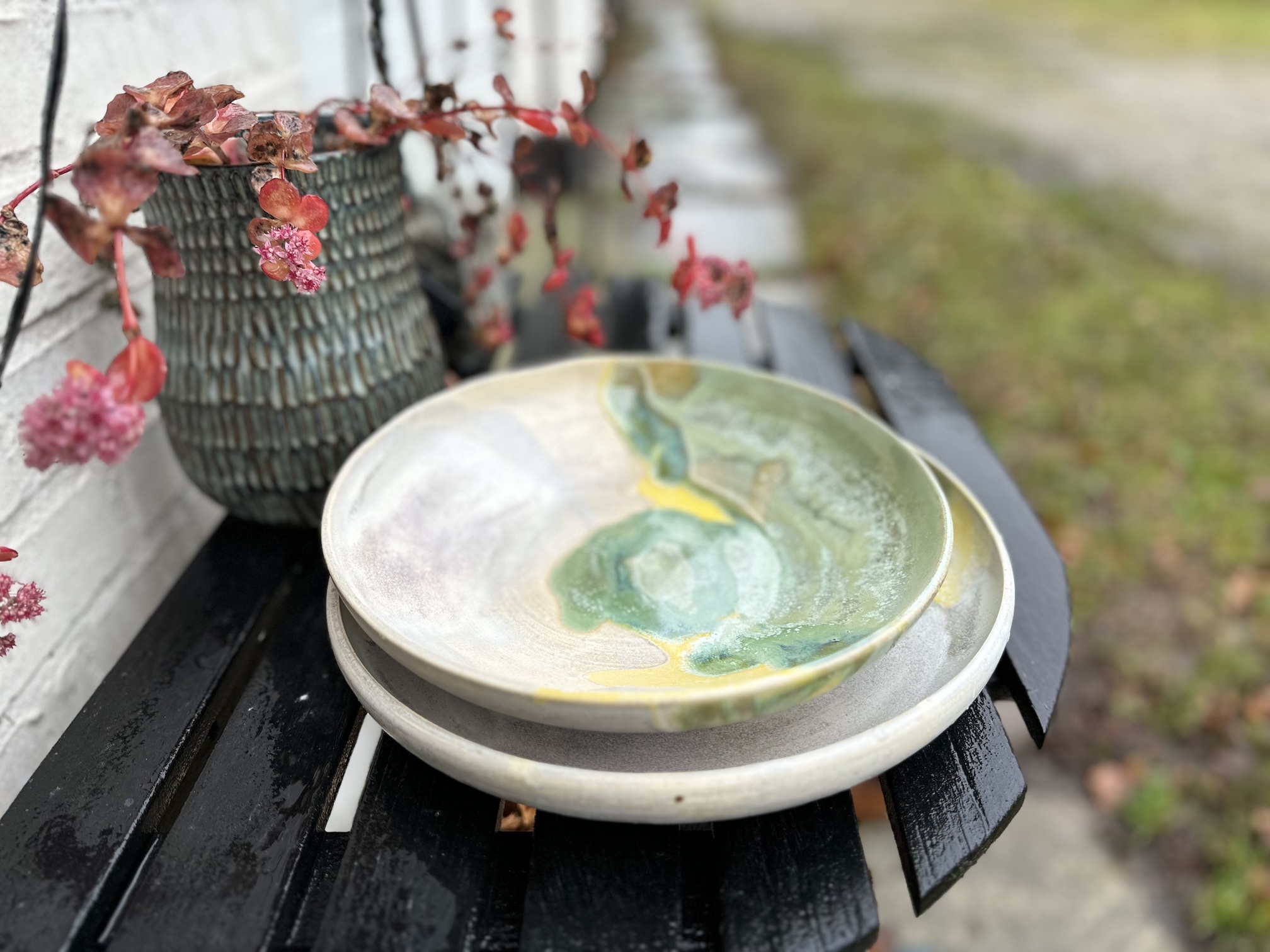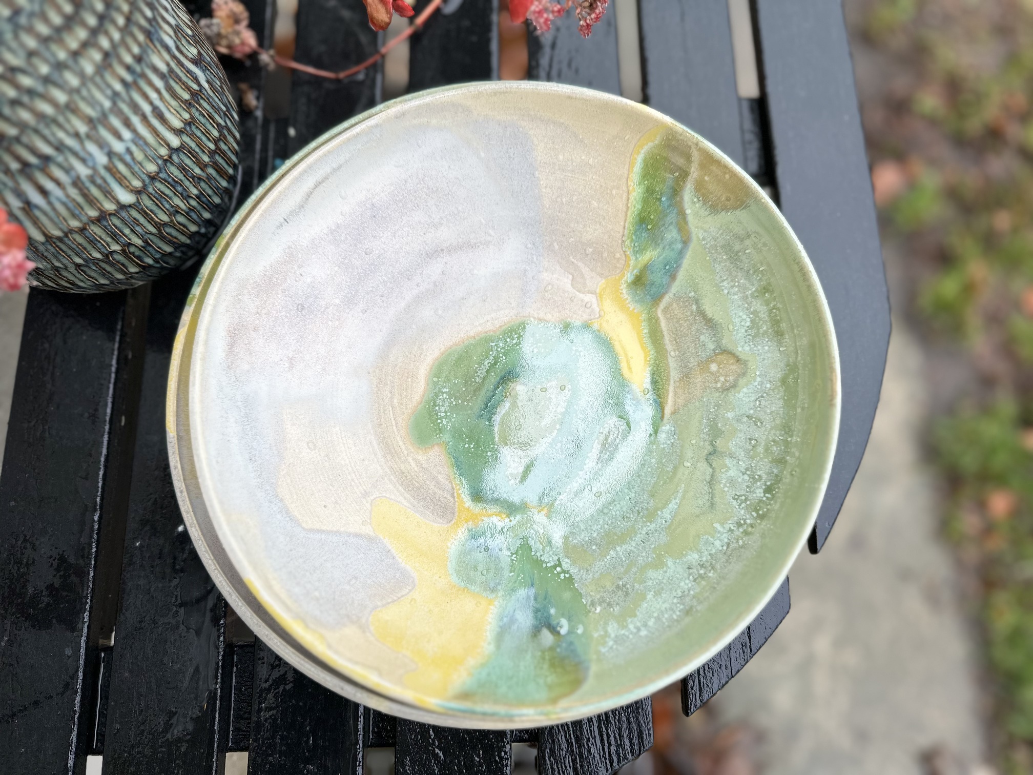 Stor smuk unika skål i stentøj og med grå, gule og grønne farver. Skålen er 27 cm i dia. og ca 7 cm høj. Brug den til alt fra salater til pasta/risretter eller blot som en smuk skål på bordet 🙂